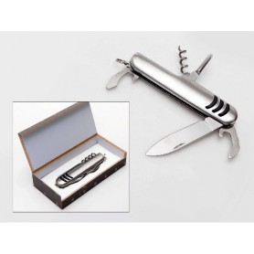 Navaja multiusos en una original caja de madera. Navaja con 5 funciones, navaja, sacacorhos, abrebotellas abrelatas y destornillador. Un...