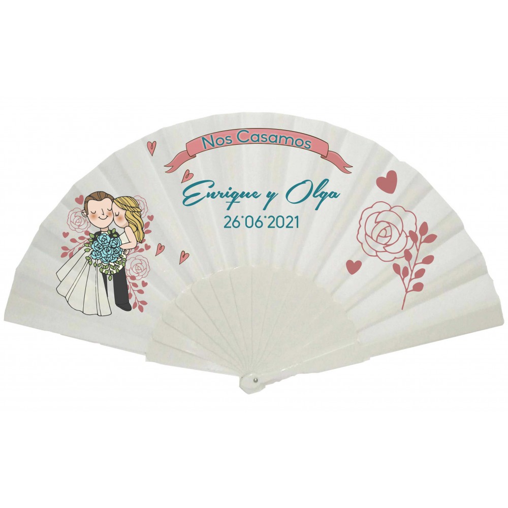 Abanico de tela blanca con 14 varillas de plástico de 23 cm.