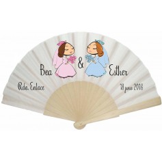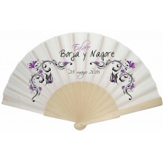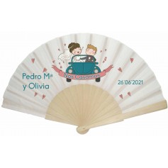 Donde le puedes incluir el texto con iniciales o completo y fecha del acontecimiento. Abanico de madera con 16 varillas en tela blanca.